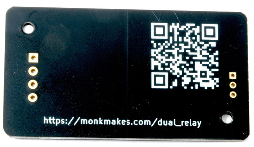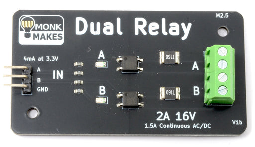MonkMakesThis two channel relay module is ideal for switching low voltage AC and DC loads. It is compatible with 3.3V and 5V microcontroller boards such as ...
