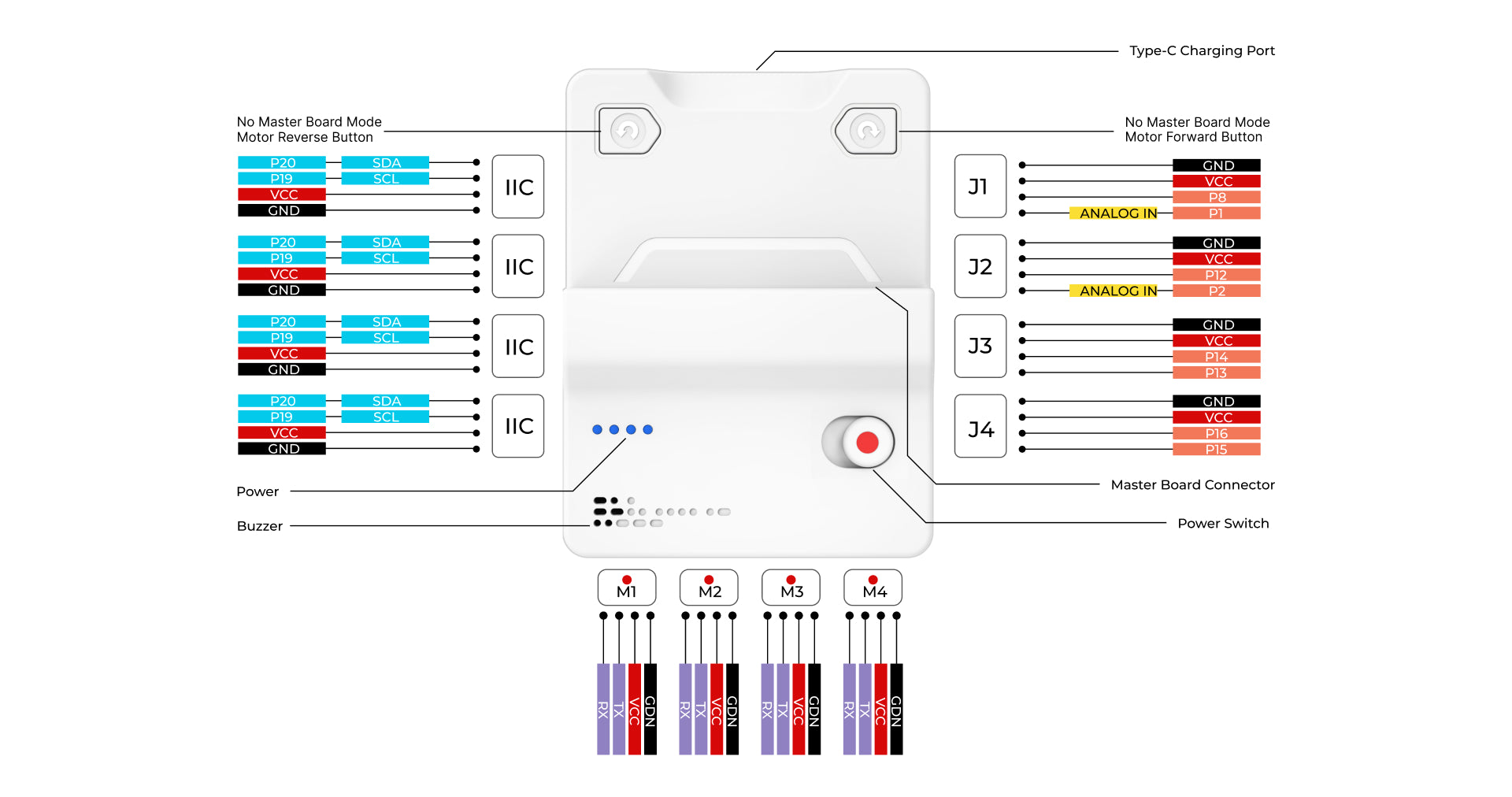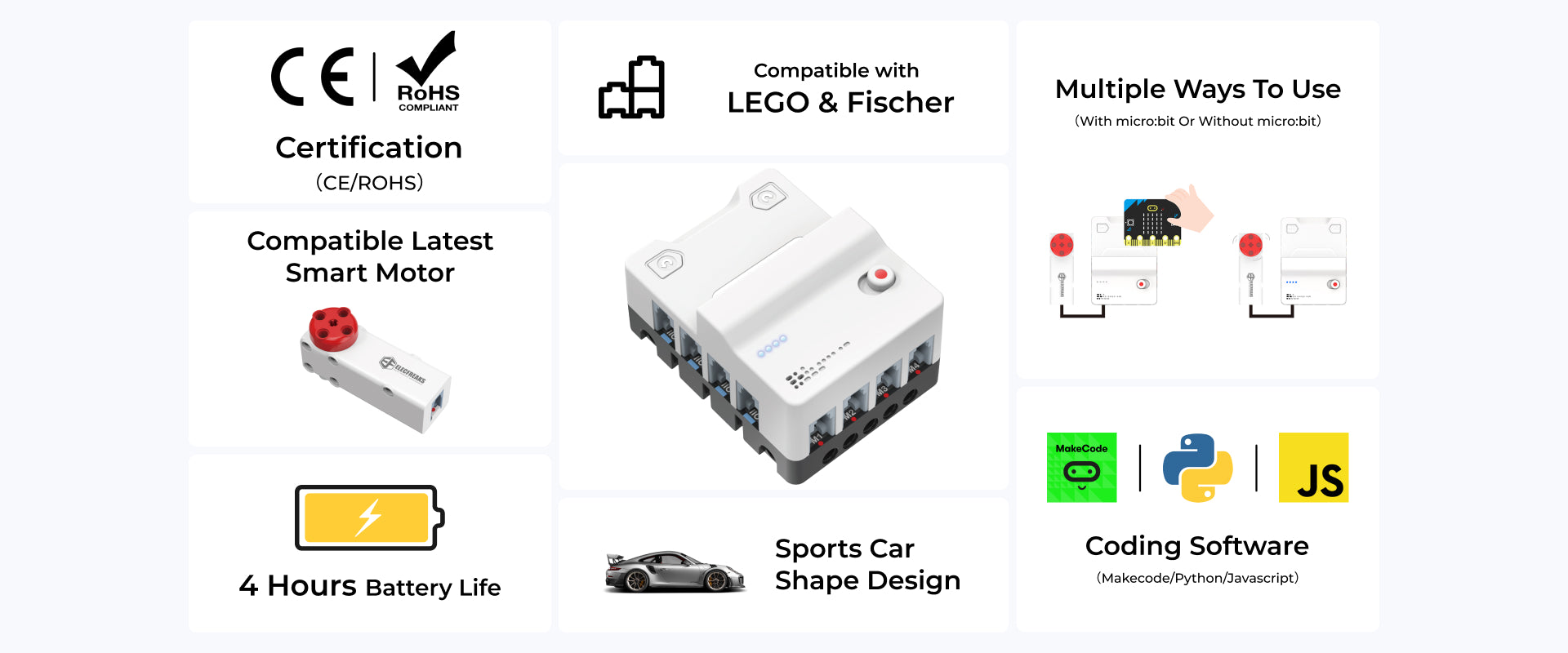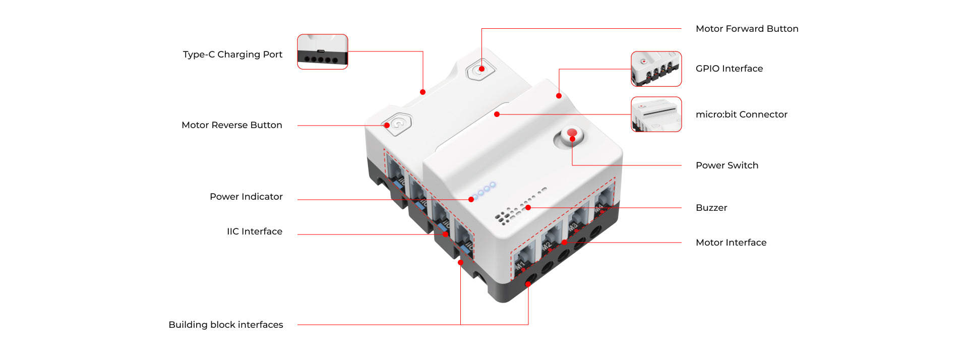 It not only integrates two convenient motor control buttons and a 4-way motor driver, but also comes with an 8-way sensor expansion port, providing students with a versatile platform for experimentation and exploration. These motor control buttons allow direct control of the motor's direction of rotation without connecting the micro:bit, increasing flexibility of operation. All interfaces use RJ11 connectors with a dud-proof, anti-reverse plug design to ensure fast and accurate connections.