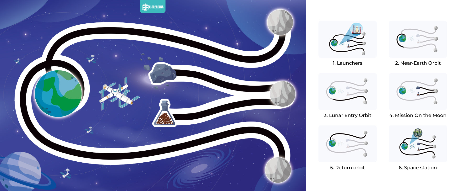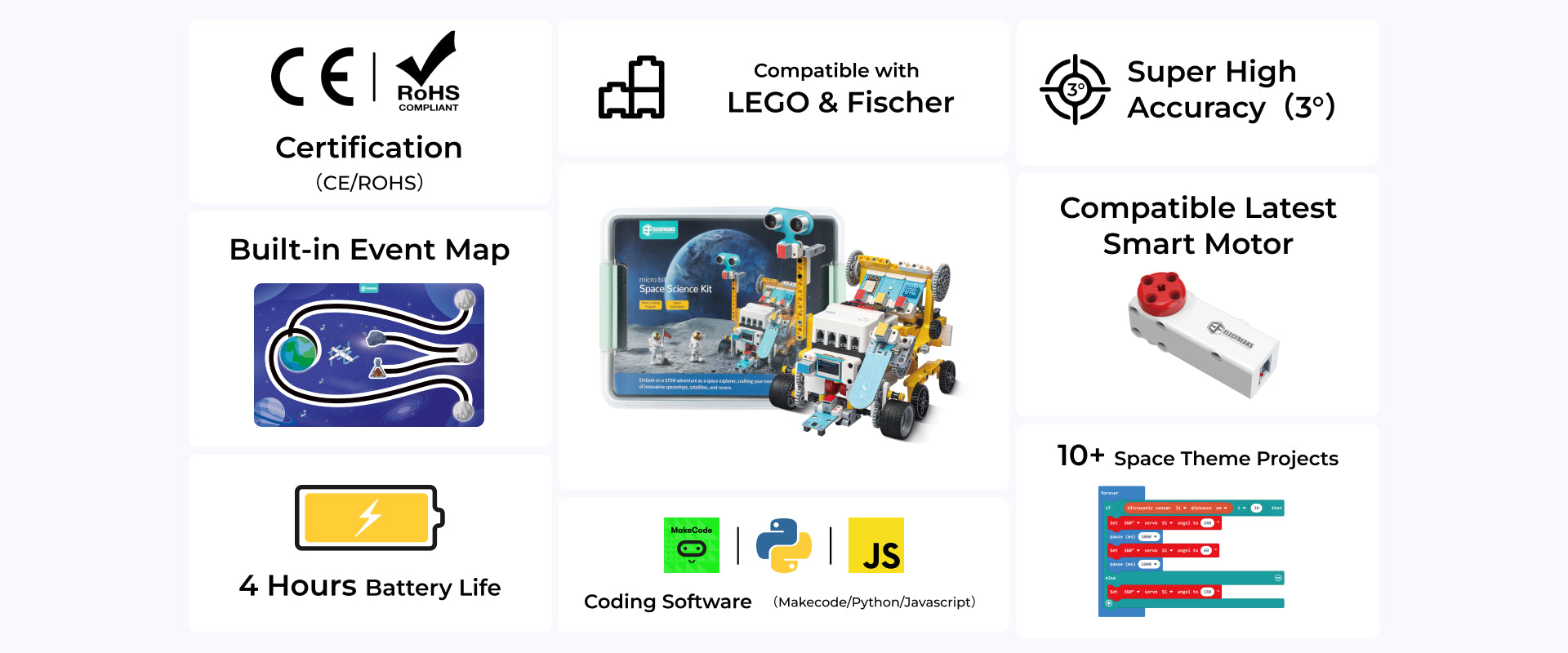 The micro:bit Space Science Kit is a STEAM education kit for elementary and middle school students. The kit uses the Nezha breakout board V2, the PlanetX Smart Motor, a variety of PlanetX sensors, a scenario-based map of the moon landing plan, and several building blocks to allow students to build projects and realize simulation missions on the moon.